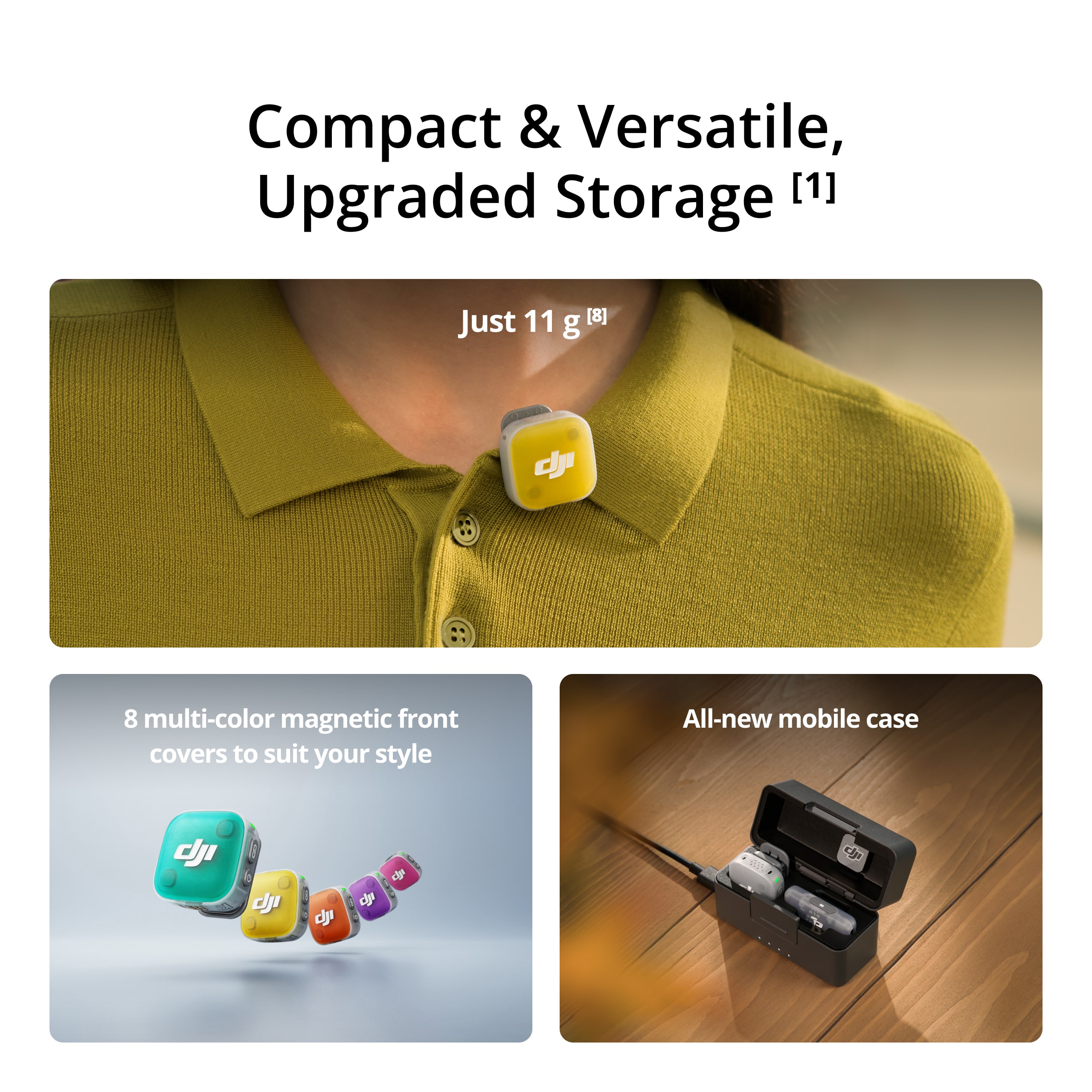 Điểm nổi bật nhất về thiết kế của DJI Mic Mini 2 chính là hệ thống faceplate từ tính (magnetic faceplate) có thể thay thế dễ dàng